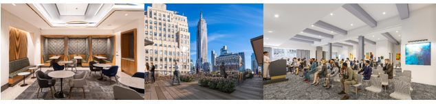 The outdoor rooftop lounge at 1333 Broadway and all-hands space at 1400 Broadway add to ESRT’s shared campus amenities