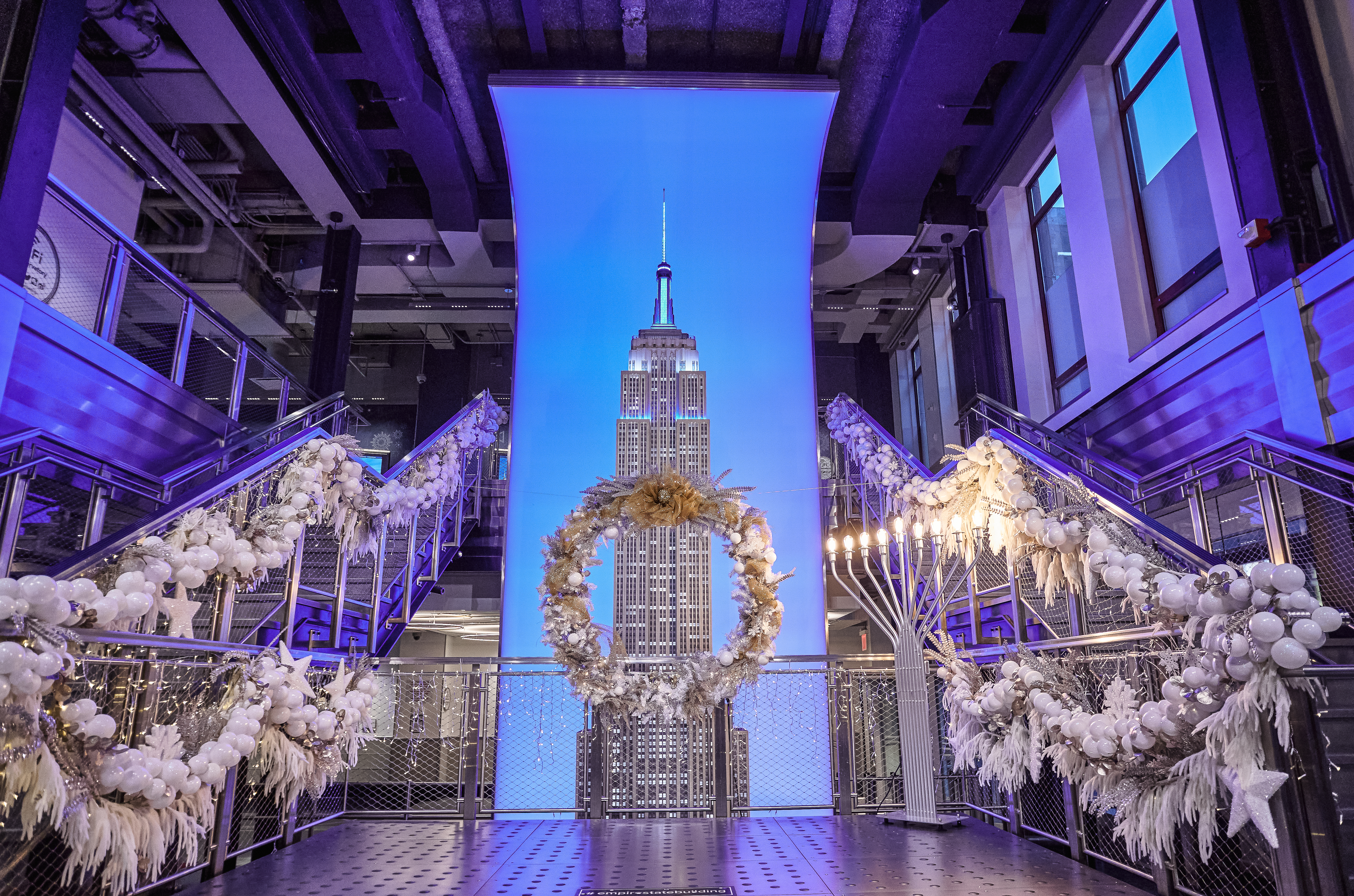 Ornaments, wreaths, tinsel, and bows with silver and gold accents adorn the entire Observatory Experience with a large, bright menorah in front of the two-story building model. Inspired by Santa’s workshop, guests can take their holiday photos on the Empire State Building’s 80th Floor in a snowy corner display with Christmas trees, wrapped presents, a cozy fireplace backdrop, and Santa’s oversized chair.